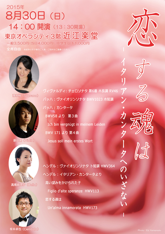 プログラムはそれぞれのソナタあり、今回はソプラノ歌手の清水梢さんをお招きして、バッハとヘンデルのカンタータも演奏します。