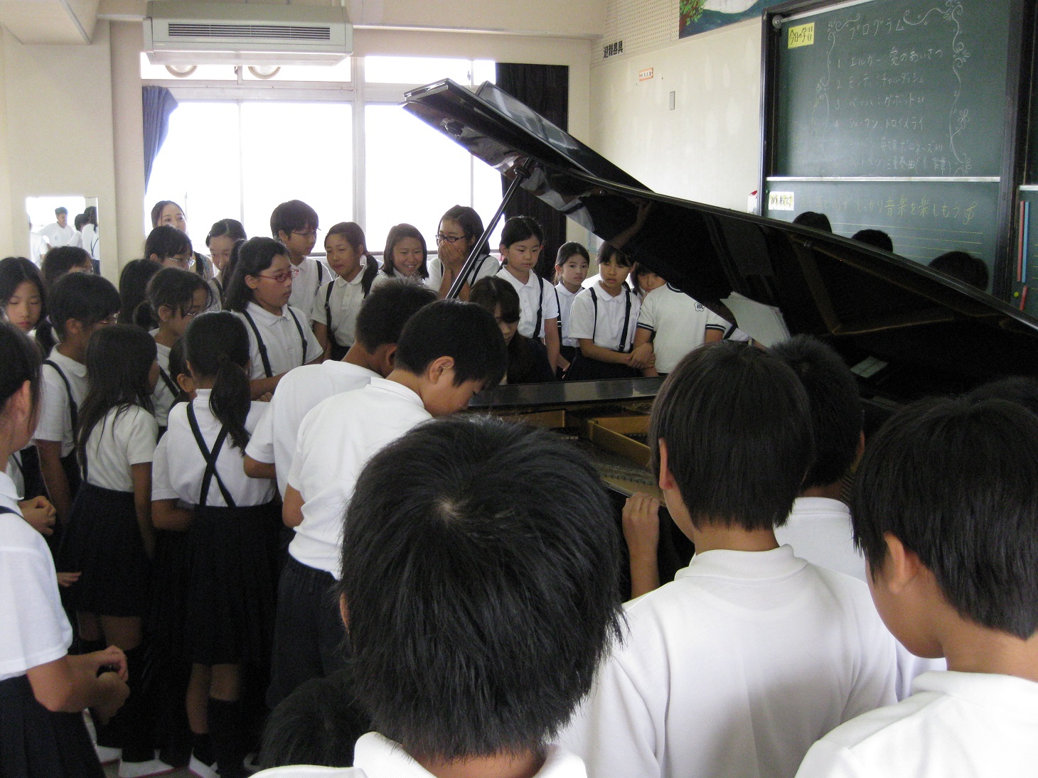 ピアノの周りに集まるこどもたち。